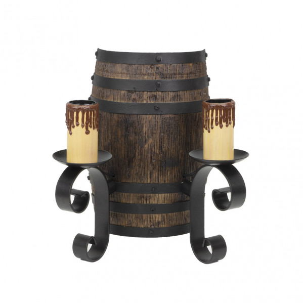 Aplique de dos luces de la serie BARRIL de color NEGRO/MARRON realizado en resina y metal, con fundas portavelas de policarbonato. Destaca por su estilo rústico, imitando a barriles, ideales para casas de campo, bodegones y salones de celebración. Tiene dos portalámparas E27. Bombillas no incluidas. Se recomienda el uso de bombillas en forma de vela para preservar su estética. Tiene unas dimensiones de 29x27x16 centímetros. En esta serie podemos encontrar la lámpara de cuatro y seis luces y los apliques de una y dos luces para conseguir su composición ideal.