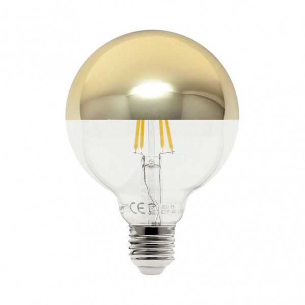 Bombilla reflectora decorativa led serie GLOBO, con filamentos realizada en cristal y mitad decorada en DORADO. Tiene una potencia de 10 watios, 950 lúmenes y 4000k de temperatura de lus, blanco natural. Con portalámpara E27, tiene unas medidas de 17,5×12,5×12,5 centímetros y un peso neto de 25 gramos.