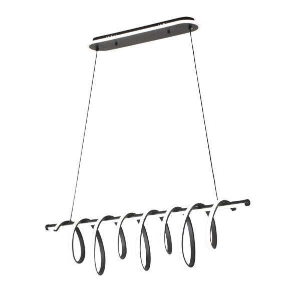 Colgante de la serie PREMIUM de color NEGRO. Este moderno colgante LED está realizado en metal y acrílico. Posee tecnología LED INTEGRADO con 157 vatios de potencia en su luz principal, 13884 lúmenes y con 3 TEMPERATURAS SELECCIONABLES DE LUZ (3000k, 4000k y 6000k) luz cálida, natural y blanco frío, también equipado con una LUZ AMBIENTE o LUZ DE NOCHE de 8,9 vatios en la estructura que va pegada al techo, pudiendo dejar solo esta luz encendida, creando un ambiente acogedor. Viene con MANDO A DISTANCIA incluido y REGULADOR DE INTENSIDAD. Se caracteriza por su diseño con formas curvas y enrolladas sobre su propia estructura con aspecto brillante, resultando un juego lumínico muy original suspendido por cables. Sus dimensiones, regulables en altura son de 55<,119,5x90x26 centímetros. Disponible en esta serie en color blanco y en negro para elegir el que mejor se adapte a su decoración.