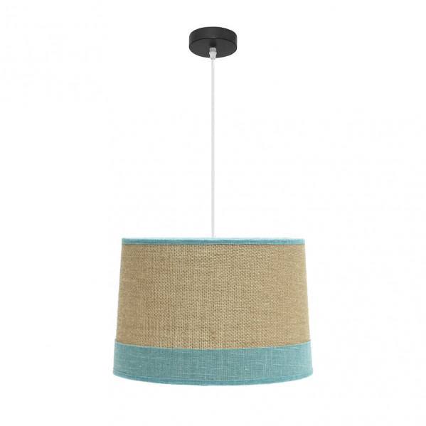 Colgante serie TIETAR con pantalla de color SACO/TURQUESA y péndel en NEGRO/BLANCO. Realizada en metal y material textil. Destaca su pantalla confeccionada con tejido de saco combinada con lino rayado. De diseño compatible con muchos estilos de decoración, desde el rústico hasta el vintage, ideal para iluminar en dormitorios, salones, despachos y salas de estar. Posee un portalámpara E27. Bombilla no incluida. Su dimensión, regulable en altura es de 35<,85x40x40 centímetros. En esta misma serie podemos encontrar a juego los sobremesas y combinando el tejido de saco con los colores turquesa, beis, negro, rojo, verde, naranja, marrón y blanco.