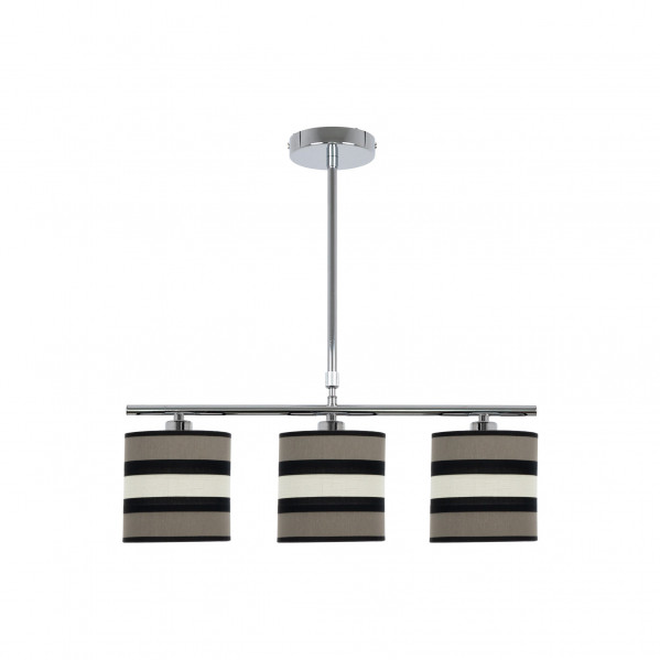 Lámpara de tres luces de la serie KARLA de color CROMO con pantalla TOPO/BEIS y vivo en negro. Realizada en metal y material textil. Destacan sus pantallas, por su diseño moderno y la combinación de sus colores. Composición muy elegante compatible con el nuevo estilo Vintage, ideal para iluminar en dormitorios, comedores, salones, despachos y salas de estar. Posee tres portalámparas E14. Bombillas no incluidas. Su dimensión, regulable en altura, es de 44<,61x55x14 centímetros. En esta misma serie podemos encontrar a juego los colgantes de 40, 50 y 60 centímetros de diámetro, dos medidas de sobremesas, el pie de salón y lámparas de cuatro, tres y dos luces, todos los modelos también en color blanco/beis.