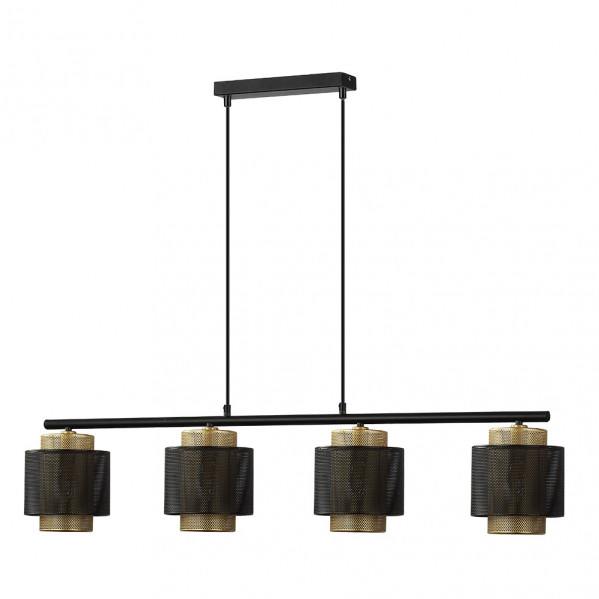 Lámpara de cuatro luces de la serie KYOTO en color NEGRO/ORO. De diseño muy original y moderno, compuesto de una estructura rígida metálica suspendida por dos enfilajes, de la que cuelgan cuatro dobles pantallas cilíndricas realizadas con rejilla metálica en dos colores que permiten pasar la luz de forma cálida y acogedora. Se puede completar con una bonita bombilla de filamentos, ideal para estancias decoradas con el nuevo estilo Vintage, tanto para decorar salones como lugares de trabajo, bares y salas de espera, aportando relax y elegancia. Posee cuatro porta lámparas E27. Bombillas no incluidas. Sus dimensión, regulable en altura es de 40<,148x106x16 centímetros. Puede completar la serie con el plafón de tres luces, colgante, pie de salón y sobremesa.
