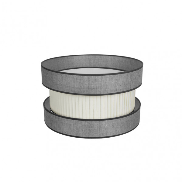 Pantalla de diseño de la serie HOME combinando tres pantallas de color GRIS/BEIS. Realizado en textil, de estilo moderno, presenta una pantalla central plisada y dos en sus extremos de color gris, ribeteadas en gris oscuro, resultando una pantalla muy original y decorativa para decorar en cualquier rincón de su hogar, ideal para colgantes y Pie de Salón. Diseñadas para cogida con portalámparas E27. Tiene unas dimensiones de 40x40x24 centímetros. Disponibles en esta serie, pantallas de 18, 30, 40,50 y 60 centímetros de diámetro, tanto en color gris-beis como en color marrón-beis.