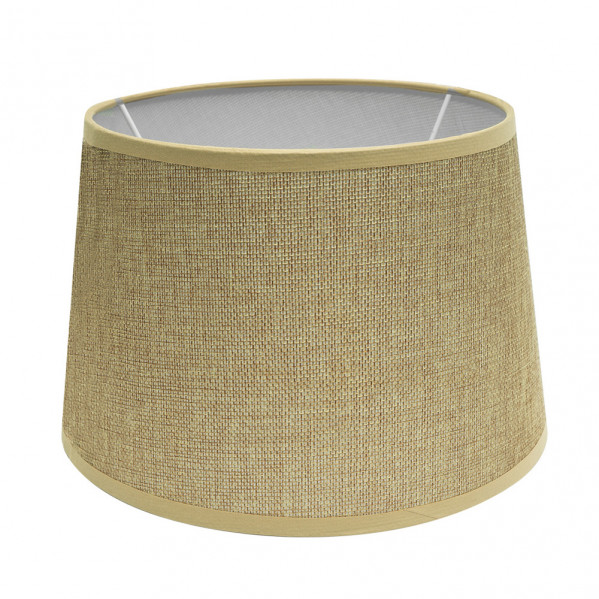 Pantalla cónica abierta serie IRENE de color BEIS. Realizado en material textil saco-yute. Diseñada para un portalámparas E27. Sus dimensiones son de 40x30x25 centímetros y un peso neto de 325 gramos. También en varios tamaños, desde 45 a 10 centímetros de diámetro.