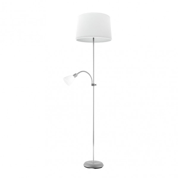 Pie de salón serie RILON con lector de color PLATA y pantalla BLANCA. Realizado en metal, policarbonato y textil. Presenta dos portalámparas, 1XE27 y 1XE14, con lector regulable en altura y orientable, lo que permite direccionar el punto de luz donde desee. Bombillas no incluidas. Es ideal tanto para estudios y espacios de trabajo como para punto de luz auxiliar en salones. Sus dimensiones son de 175,5X40X40 centímetros y su peso neto es de 3275 gramos.. Está disponible también en color Blanco, Marrón y Negro.