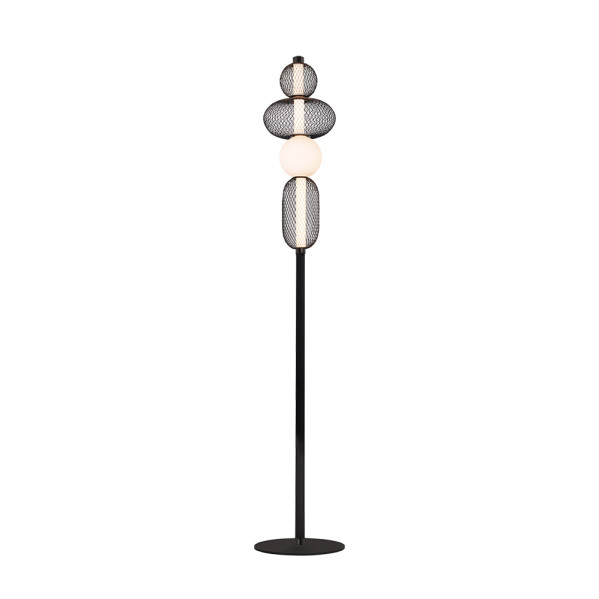 Pie de Salón de la serie MIMOSA de color NEGRO. Este moderno pie LED está realizado en metal y cristal. Posee tecnología LED INTEGRADO con 20 vatios de potencia, 2200 lúmenes y 4000k de temperatura de luz, blanco natural. Se caracteriza por su diseño original, combinando en su parte central varios cuerpos geométricos realizados en malla metálica y atravesados por un tubo lumínico de cristal y por una tulipa esférica también de cristal, resultando una bonita composición asimétrica muy decorativa. Puede combinarse con otros elementos de esta serie, dando un toque exclusivo, elegante y sofisticado para decorar en cualquier esquina de comedores, salones y zonas de trabajo. Ideal para estancias decoradas con los nuevos estilos de decoración, en el que se mezclan texturas y materiales diferentes, dando lugar también a decoraciones Vintage y Boho Chic, haciéndose el centro de la estancia que iluminan. Tiene unas dimensiones de 155x25x25 centímetros. En esta misma serie encontramos hasta cuatro tipos diferentes de colgantes modernos, sobremesa y pie de salón, todos a juego.
