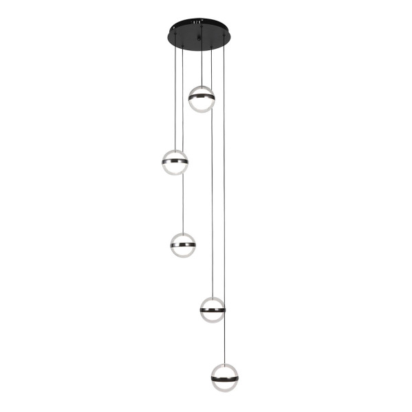 Plafón colgante de cinco luces de la serie PEOPLE en color NEGRO. Realizado en metal y acrílico. Destacan sus tulipas esféricas colgantes presentando un diseño muy original y moderno. Este plafón permite colocar sus tulipas suspendidas en disposición circular y a distintas alturas, creando así una composición muy decorativa. Posee TECNOLOGIA LED INTEGRADO con una potencia de 140 vatios, 10920 lúmenes y TRES TEMPERATURAS SELECCIONABLES de luz 3000k, 4000k y 6000k (luz cálida, blanco natural y blanco frío). Viene con MANDO A DISTANCIA incluido y REGULADOR DE INTENSIDAD, pudiendo crear así varios ambientes dependiendo de la actividad a desarrollar. Ideal para decoraciones modernas aptas para iluminar en salones y comedores, e incluso en zonas de trabajo. Tiene unas dimensiones regulables en altura, de 175<,180x35x35 centímetros. Encontramos en esta serie plafones colgantes con 5 y 7 luces, para elegir la combinación que mejor se adapte a su decoración.