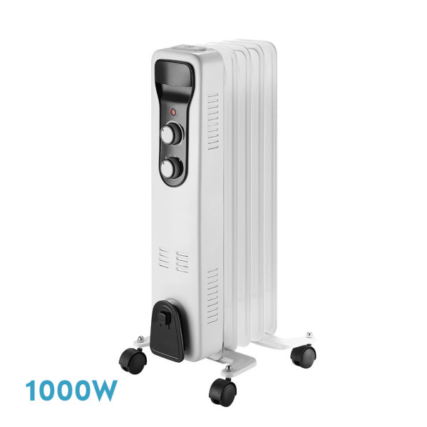 Radiador de Aceite eléctrico de la serie BRASILIA en color BLANCO/NEGRO. Realizado en metal y ABS. Equipado con 1000 watios de potencia repartidos en sus 5 elementos calefactores, que permiten calentar eficazmente y con bajo consumo cualquier estancia. Con tres potencias seleccionables, 400w/600w/1000w para elegir, dependiendo del espacio y la rapidez con la que desea se caliente la estancia, viene con control de Termostato Ajustable, sistema de protección sobrecalentamiento, SISTEMA ANTIVUELCO y luz indicadora de encendido. Se presenta con un diseño fácil de transportar gracias a su asa y a sus ruedas para facilitar el desplazamiento. Con un útil soporte en su estructura para enrollar el cable. Tiene unas dimensiones de 59,5×25,5×24 centímetros. Disponible en esta serie de 1000w, 1500w, 2000w y 2500w de máxima potencia con sus respectivos tamaños.