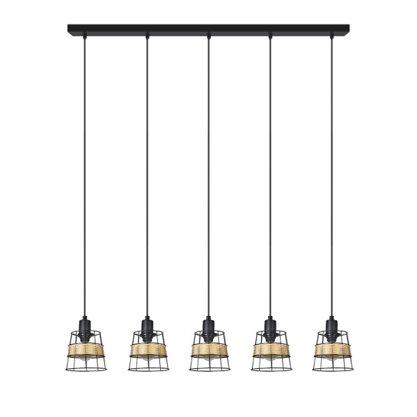 Regleta de cinco luces colgantes de la serie BURANO realizado en FORJA/RATTAN con acabado en color NEGRO. Con un diseño moderno y elegante, destacan sus pantallas cónicas abiertas suspendidas, pudiéndose disponer a la misma o a distintas alturas, mezclando texturas como son la forja y el rattán. Con cinco portalámparas en E14 . Bombillas no incluidas. Ideal para salones, comedores y salas de estar decoradas con estilos Boho Chic y Vintage e incluso para zonas de trabajo decoradas con estilo moderno y rústico. Se recomienda completar con bombillas de filamentos para preservar su estética. Sus dimensiones, regulables en altura, son de 33<,150x94x12 centímetros. Modelo también en versión de plafón de tres luces, colgante, sobremesa y pie de salón.