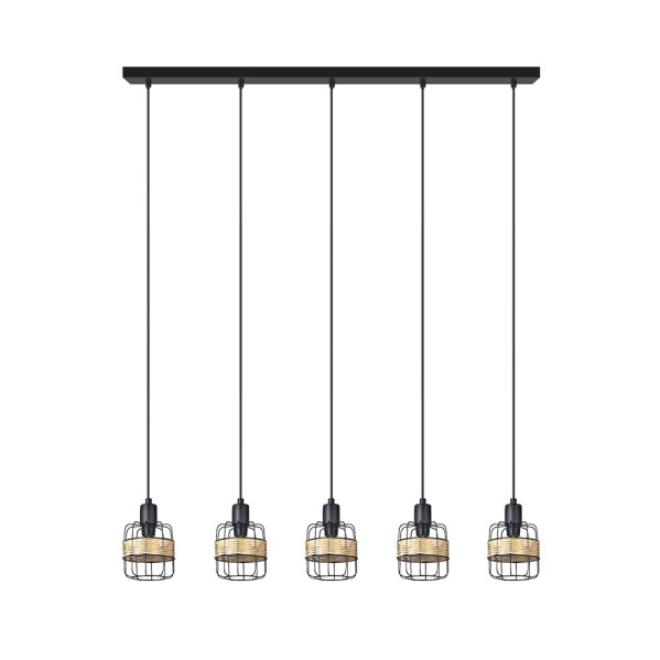 Regleta de cinco luces colgantes de la serie ZENDA realizado en FORJA/RATTAN con acabado en color NEGRO. Con un diseño moderno y elegante, destacan sus pantallas redondeadas suspendidas, pudiéndose disponer a distintas alturas, mezclando texturas como son la forja y el rattán. Con cinco portalámparas en E14 . Bombillas no incluidas. Ideal para salones y salas de estar decoradas con estilos Boho Chic y Vintage e incluso para zonas de trabajo decoradas con estilo moderno y rústico. Se recomienda completar con bombillas de filamentos para preservar su estética. Sus dimensiones, regulables en altura, son de 33<,150x94x10 centímetros. Modelo también en versión de plafón de tres luces, colgante, sobremesa y pie de salón.