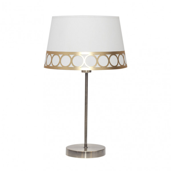 Sobremesa de la serie DALIA de color BLANCO/ORO. Está realizado en metal y material textil, con cenefa decorativa de motivos circulares. Posee un porta lámparas E14. Bombilla no incluida. Tiene unas dimensiones de 44x25x25 centímetros. La familia se puede completar con el sobremesa, pie de salón y lámpara de tres y dos luces. Disponible todas las versiones en color blanco/plata, blanco/oro y beis/marrón.