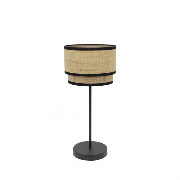Sobremesa serie ROQUE de color NATURAL/NEGRO. Posee un portalámparas E14. Bombilla no incluida. Pantalla formada por dos cuerpos en textil y base metálica. Sus dimensiones son 41x18x18 centímetros. En esta serie podemos encontrar los colgantes de 60, 50 y 40 centímetros de diámetros, dos tamaños diferentes de sobremesas y los apliques, todos realizados en arpillera natural ribeteados en color negro, rojo o marrón.