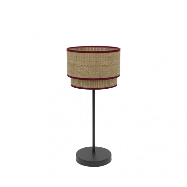 Sobremesa serie ROQUE de color NATURAL/ROJO. Posee un portalámparas E14. Bombilla no incluida. Pantalla formada por dos cuerpos en textil y base metálica de color marrón. Sus dimensiones son 41x18x18 centímetros. En esta serie podemos encontrar los colgantes de 60, 50 y 40 centímetros de diámetros, dos tamaños diferentes de sobremesas y los apliques, todos realizados en arpillera natural ribeteados en color negro, rojo o marrón.